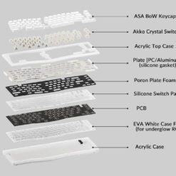 Phụ kiện đi kèm: 01 Dây cáp USB Type-C 2 Type-A + 01 set keycap tặng kèm (kết hợp cùng keycap lắp sẵn trên phím sẽ thành full set Blue on White) + 01 keypuller + 01 switch puller + 01 PC Plate + 01 túi gasket silicone + Chân đế dựng phím làm bằng acrylic + 01 tua-vít lục giác + 01 Daughterboard